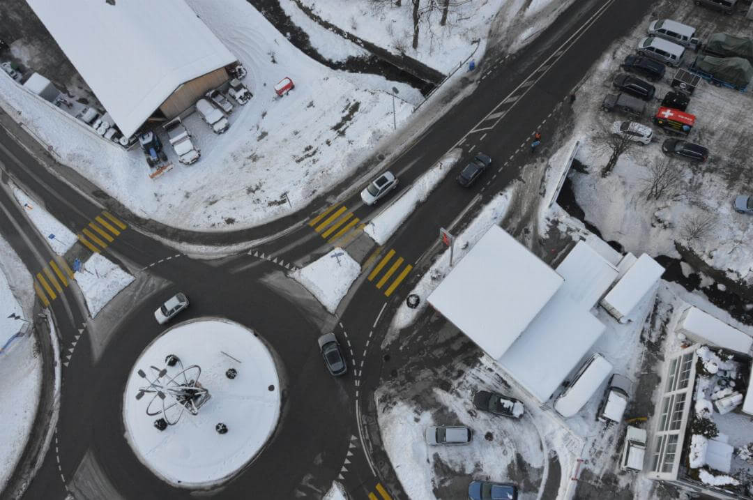 Erst treibt uns der Wind auf die falsche Seite des Tals, dann in die Nähe einer Starkstromleitung – doch Favre findet gekonnt einen Weg heraus, indem er in höheren Schichten von anderem Wind profitiert. Wir landen schliesslich mitten auf der Hauptstrasse.
