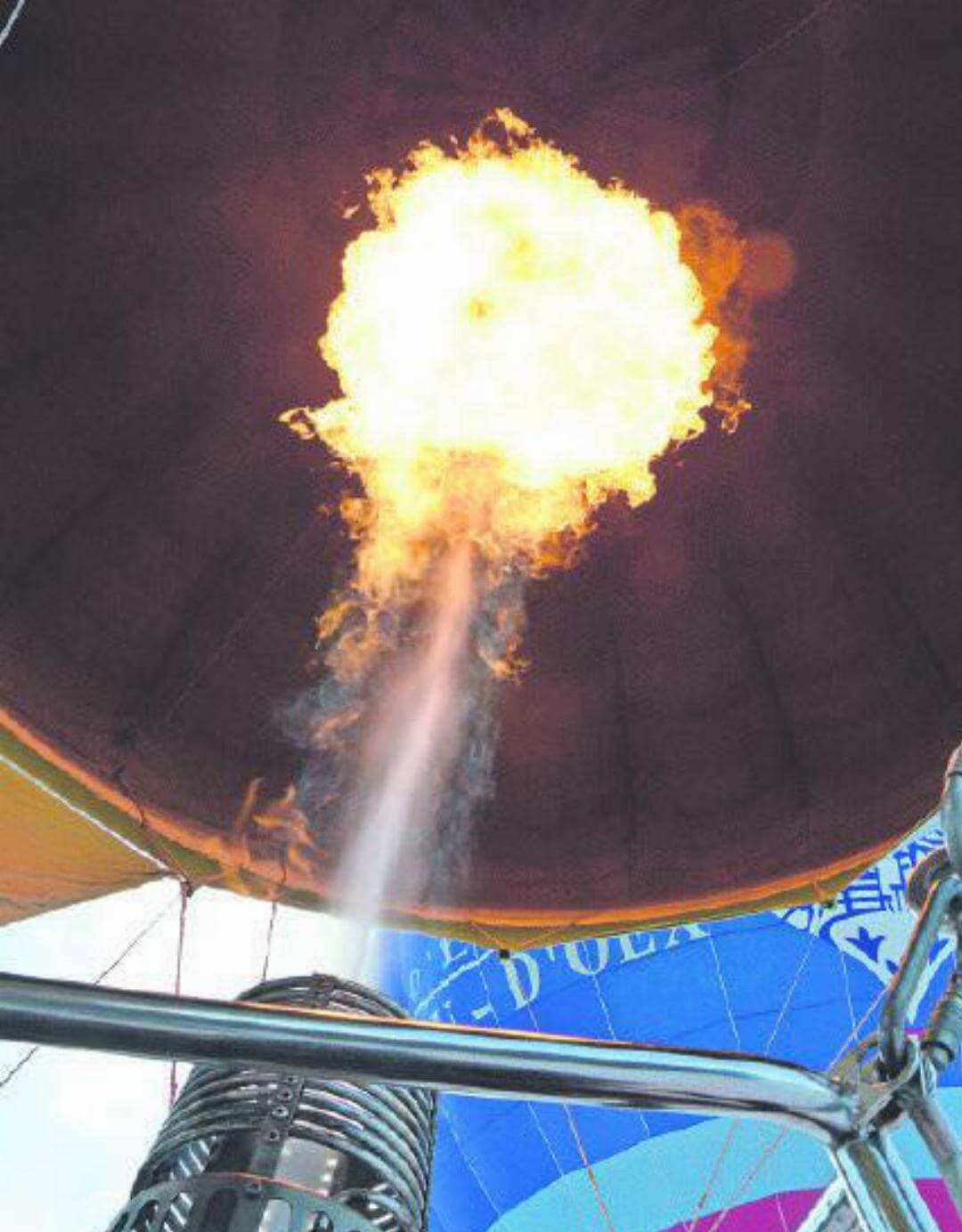 Dort wartet eine Fluglotsin auf uns. Sie erteilt uns vorläufig keine Starterlaubnis – ein anderer Ballon ist noch über uns. Einen Moment später kommt ihr Zeichen, Favre gibt kräftig Gas, die mehrere Meter hohe Flamme heizt den Ballon – und wir heben ab.